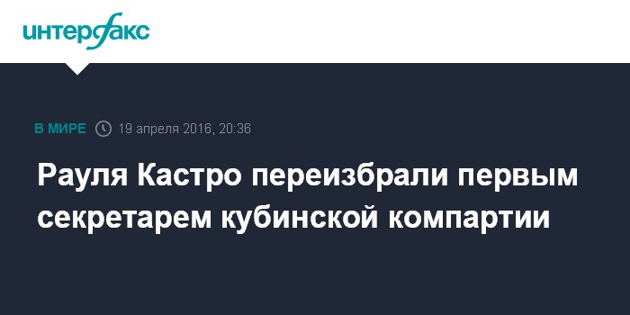 Москва. 19 апреля. INTERFAX.RU - Председатель Госсовета Кубы Рауль Кастро переизбран во вторник первым секретарем Центрального комитета Коммунистической партии страны, сообщает агентство ЭФЭ.