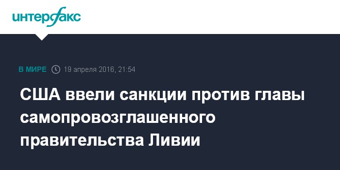 Москва. 19 апреля. INTERFAX.RU - США ввели санкции против главы базирующегося в Триполи самопровозглашенного правительства Ливии Халифа аль-Гвелла, сообщают во вторник западные СМИ.
