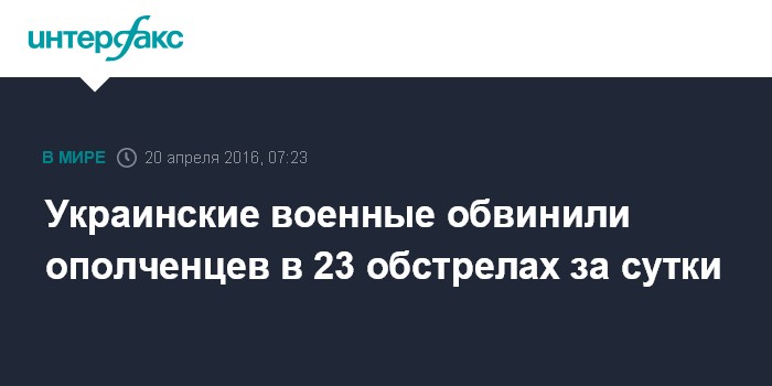 Москва. 20 апреля. INTERFAX.RU - За минувшие сутки ополченцы 23 раза обстреляли позиции украинских военных в Донбассе, сообщает в среду утром пресс-центр штаба силовой операции в Facebook.