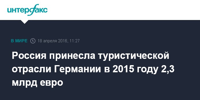 Москва. 18 апреля. INTERFAX.RU - Россия занимает седьмое место в списке стран, принесших наибольший доход туристической отрасли Германии в 2015 году, заявила в понедельник глава национального туристического офиса ФРГ Петра Хедорфер.