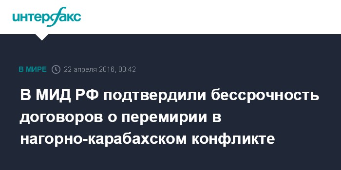 Москва. 22 апреля. INTERFAX.RU - Соглашения о прекращении огня в Нагорном Карабахе от 1994 и 1995 годов остаются основной перемирия в зоне конфликта, заявили в МИД РФ.