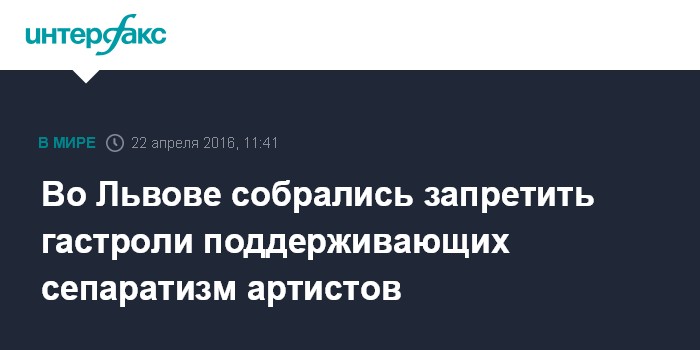Москва. 22 апреля. INTERFAX.RU - Львовский городской совет принял на сессии 21 апреля решение, которым запретил в городе гастроли артистов, "поддерживающих агрессию России и пропагандирующих сепаратизм в Украине".