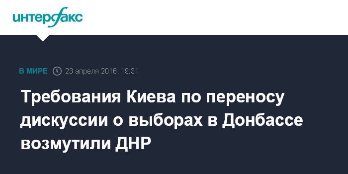 Москва. 23 апреля. INTERFAX.RU - В самопровозглашенной Донецкой народной республике напоминают Киеву, что проведению местных выборов в Донбассе должно предшествовать выполнение политической части комплекса мер Минских соглашений, а не дискуссия "философско-мировоззренческого характера".