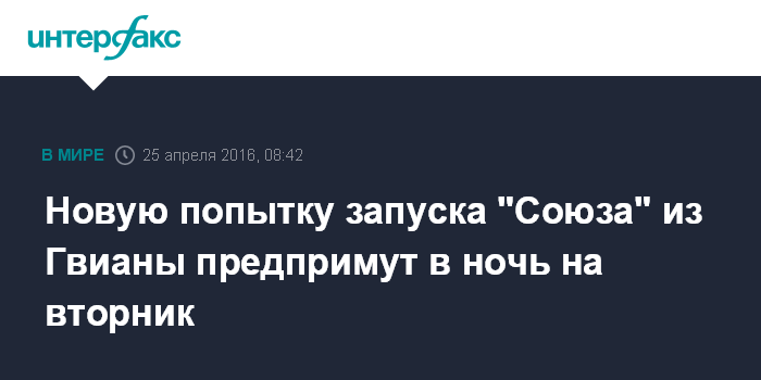 Москва. 25 апреля. INTERFAX.RU - Очередная попытка запуска ракеты-носителя "Союз-СТА" со спутником Sentinel-1B из Гвианского космического центра запланирована в ночь на вторник, сообщил "Интерфаксу" источник в ракетно-космической отрасли.