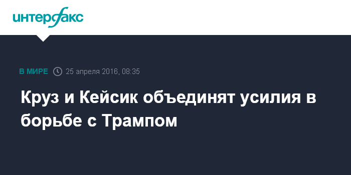 Москва. 25 апреля. INTERFAX.RU - Сенатор от штата Техас Тед Круз и губернатор штата Огайо Джон Кейсик договорились координировать свои предвыборные кампании, чтобы не дать возможность лидеру республиканской гонки Дональду Трампу обеспечить себе выдвижение в качестве кандидата от партии.