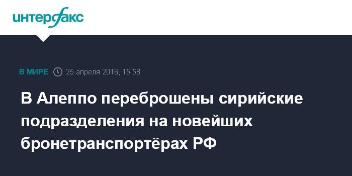 Москва. 25 апреля. INTERFAX.RU - Командование сирийской армии в ходе подготовки к наступательной операции в провинции Алеппо перебрасывает туда подразделения, на вооружении которых находятся новейшие бронетранспортеры БТР-82А российского производства, сообщило в понедельник иранское информагентство "Фарс" со ссылкой на сирийские военные источники.