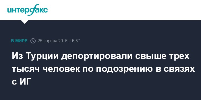 Москва. 25 апреля. INTERFAX.RU - Турция депортировала свыше 3,3 тыс. иностранцев, подозреваемых в связях с исламскими радикалами, в частности с "Исламским государством" (ИГ, организация, запрещенная в России), сообщила в понедельник турецкая газета Hurriyet со ссылкой на высокопоставленного чиновника.