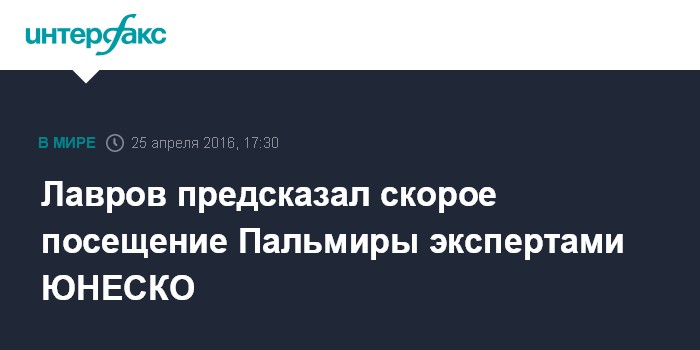 Москва. 25 апреля. INTERFAX.RU - Условия для посещения Пальмиры экспертами ЮНЕСКО вскоре будут созданы, заявил глава МИД РФ Сергей Лавров.