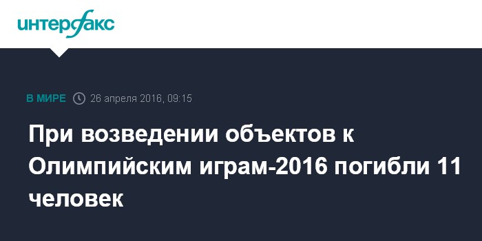 Москва. 26 апреля. INTERFAX.RU - В ходе строительства объектов к Олимпийским летним играм 2016 года в Рио-де-Жанейро зафиксировано 11 случаев гибели работников, сообщает пресс-служба регионального управления труда Бразилии.