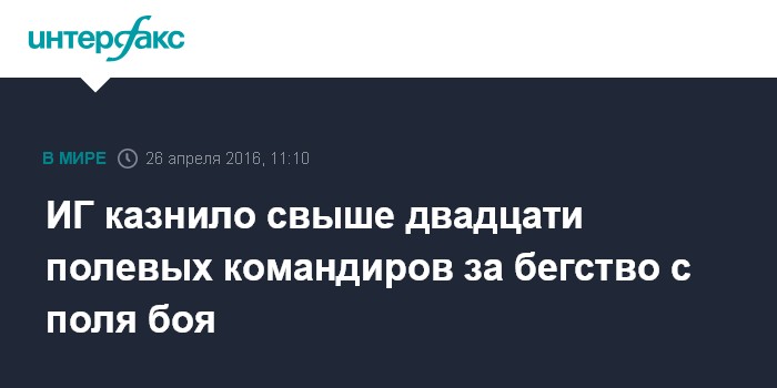 Москва. 26 апреля. INTERFAX.RU - Запрещенная в России экстремистская группировка "Исламское государство" казнила свыше двадцати полевых командиров за бегство с поля боя, сообщает сайт almasdarnews