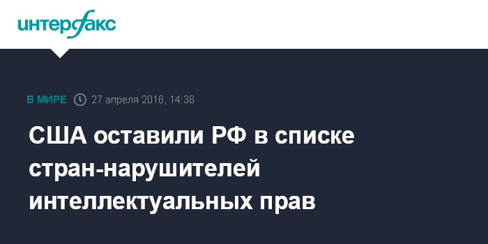 Москва. 27 апреля. INTERFAX.RU - Россия наряду с десятью другими странами остается в американском списке стран-нарушителей прав интеллектуальной собственности, сообщает агентство Associated Press.