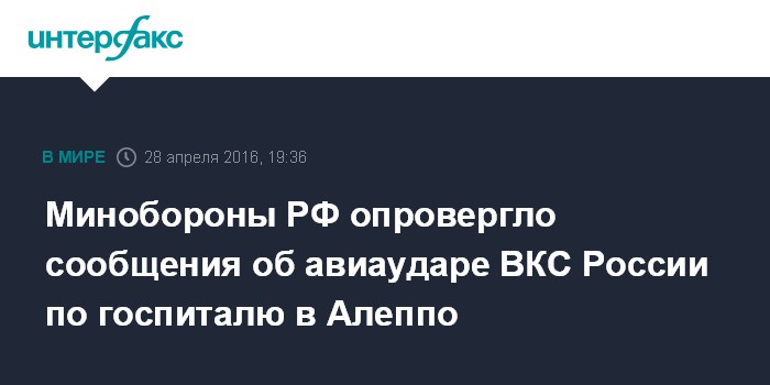 Москва. 28 апреля. INTERFAX.RU - Российские военные опровергли сообщения западных СМИ о том, что Воздушно-космические силы РФ нанесли авиаудар по госпиталю в Алеппо.