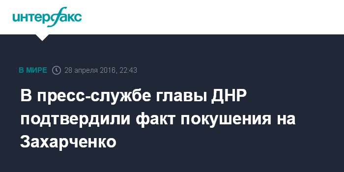 Москва. 28 апреля. INTERFAX.RU - Пресс-служба главы самопровозглашенной Донецкой народной республики (ДНР) Александра Захарченко официально подтвердила факт покушения против него.