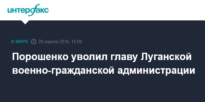Москва. 29 апреля. INTERFAX.RU - Президент Украины Петр Порошенко уволил главу Луганской областной военно-гражданской администрации, в пятницу будет представлен новый руководитель ОВГА, сообщил агентству "Интерфакс" информированный источник.