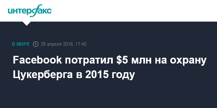 Москва. 29 апреля. INTERFAX.RU - Компания Facebook Inc. в 2015 году потратила $5 млн на масштабную программу по обеспечению безопасности своего CEO и основателя Марка Цукерберга, сообщает MarketWatch со ссылкой на документы, направленные компанией регуляторам.