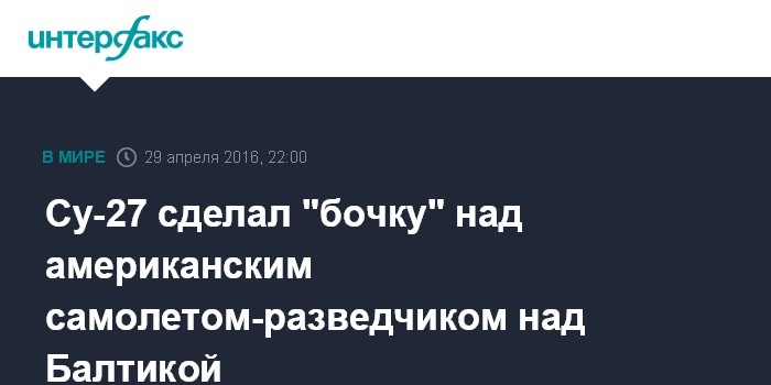 Москва. 29 апреля. INTERFAX.RU - Российский истребитель Су-27 в пятницу сделал "бочку" над самолетом-разведчиком ВВС США RC-135, который совершал разведывательный полет в международном воздушном пространстве над Балтийским морем, сообщает американский телеканал CNN со ссылкой на представителя министерства обороны США.