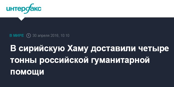 Москва. 30 апреля. INTERFAX.RU - Около 4 тонн российской гуманитарной помощи, в том числе около тонны хлеба, выпеченного в Сирии из российской муки, доставили в сирийскую провинцию Хама, сообщил журналистам представитель Центра по примирению враждующих сторон в Сирии полковник Сергей Иванов.