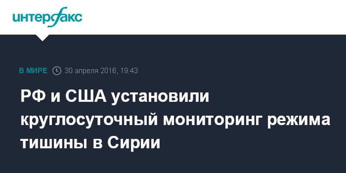 Москва. 30 апреля. INTERFAX.RU - России и США ведут круглосуточный мониторинг режима тишины на севере провинции Латакия и в пригороде Дамаска, сообщили в Минобороны РФ.