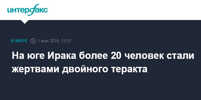Москва. 1 мая. INTERFAX.RU - Не менее 22 человек погибли в результате двойного теракта в городе Эс-Самава на юге Ирака, сообщили агентству EFE в правоохранительных органах страны.