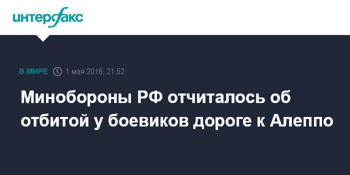 Москва. 1 мая. INTERFAX.RU - Боевики террористической группировки "Джабхат ан-Нусра" (запрещена в РФ) попытались взять под свой контроль дорогу, ведущую на Алеппо, но были отбиты, сообщили в Министерстве обороны РФ.