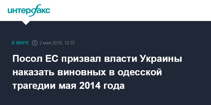 Москва. 2 мая. INTERFAX.RU - Глава представительства Европейского Союза на Украине Ян Томбинский призвал Киев провести независимое и прозрачное расследование трагических событий в Одессе 2 мая 2014 года и наказать виновных.