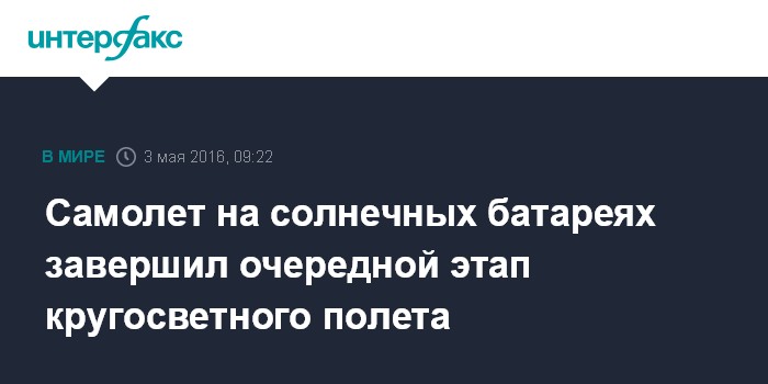Москва. 3 мая. INTERFAX.RU - Самолет на солнечных батареях Solar Impulse 2 совершил посадку в городе Феникс американского штата Аризона, сообщили во вторник местные СМИ.
