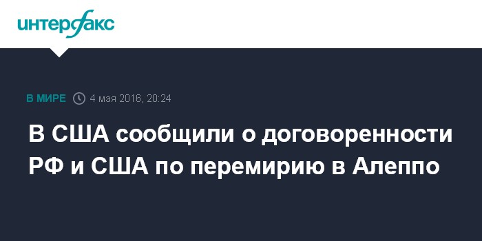 Москва. 4 мая. INTERFAX.RU - Представители США и РФ достигли согласия по вопросу о распространения перемирия между сторонами конфликта в Сирии на Алеппо, сообщает в среду агентство Associated Press со ссылкой на неназванные американские официальные лица.