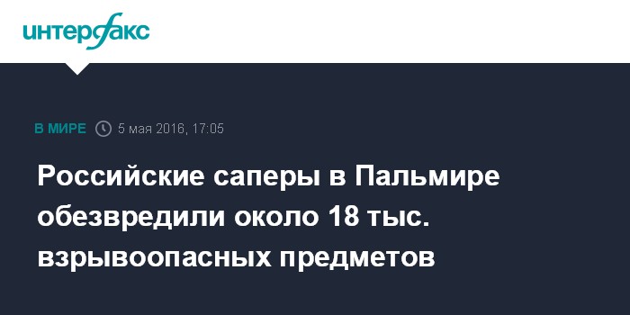 Москва. 5 мая. INTERFAX.RU - После очистки исторической части Пальмиры от взрывоопасных предметов российские саперы приступили к очистке жилых кварталов города.