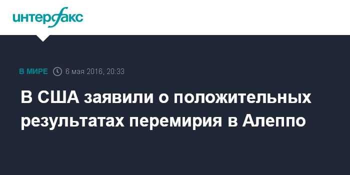 Москва. 6 мая. INTERFAX.RU - Перемирие в Алеппо, заключенное между сторонами сирийского конфликта, в целом, привело к заметному снижению уровня насилия, заявил в пятницу представитель госдепа США Джон Кирби.