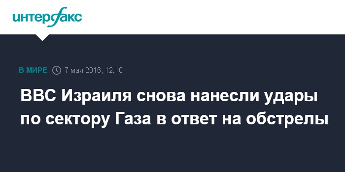 Москва. 7 мая. INTERFAX.RU - ВВС Израиля в субботу нанесли удары по двум объектам движения ХАМАС в секторе Газа в ответ на ракетную атаку по израильской территории из этого района, сообщает интернет-газета The Times of Israel.