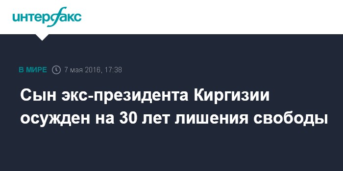 Москва. 7 мая. INTERFAX.RU - Младший сын бывшего президента Киргизии Курманбека Бакиева Максим признан виновным по трем статьям Уголовного кодекса и приговорен к 30 года лишения свободы и выплате штрафа, сообщили в субботу "Интерфаксу" в пресс-службе Верховного суда (ВС).