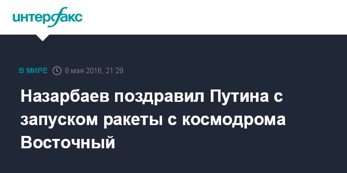 Москва. 8 мая. INTERFAX.RU - Президент Казахстана Нурсултан Назарбаев поздравил президента России Владимира Путина с успешным запуском ракеты с космодрома Восточный.