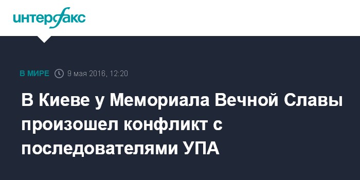 Москва. 9 мая. INTERFAX.RU - У Мемориала Вечной Славы в Киеве в понедельник возник конфликт между группой молодежи, которая развернула красно-черный флаг "Украинской повстанческой армии" (организация запрещена в России), и людьми, возлагавшими цветы к монументу в рамках акции "Бессмертный полк".