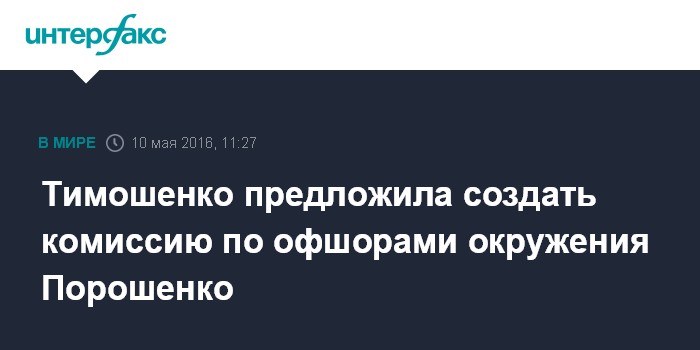 Москва. 10 мая. INTERFAX.RU - В Верховной Раде должна быть создана временная следственная комиссия, которая займется вопросом причастности окружения президента Украины Петра Порошенко к офшору с российским "Газпромом", считает руководитель фракции "Батькивщина" Юлия Тимошенко.