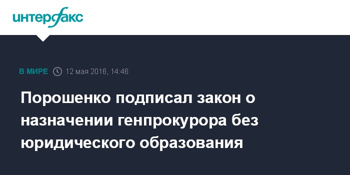 Москва. 12 мая. INTERFAX.RU - Президент Украины Петр Порошенко подписал принятый в четверг парламентом закон, позволяющий назначать на должность Генпрокурора Украины людей без высшего юридического образования, сообщил "Интерфаксу" пресс-секретарь президента Святослав Цеголко.