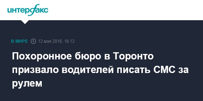 Москва. 12 мая. INTERFAX.RU - Рекламный щит со словами "Пиши СМС за рулем" и названием похоронного бюро появился в пригороде Торонто, пишет The Mashable.