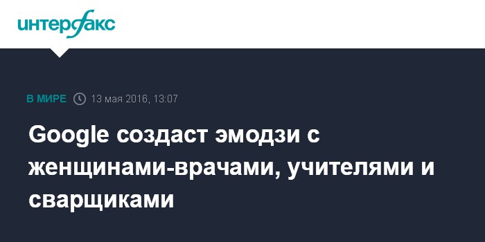 Москва. 13 мая. INTERFAX.RU - Google создаст 13 эмодзи с женщинами-представительницами разных профессий, в том числе врача, ученого, программиста и сварщика, чтобы побороть гендерное неравенство, пишет Mashable.