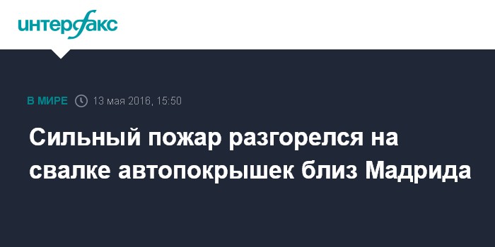 Москва. 13 мая. INTERFAX.RU - Сильный пожар разгорелся в пятницу на крупнейшей в Испании свалке автомобильных шин недалеко от Мадрида, сообщает сайт испанской газеты El Pais.