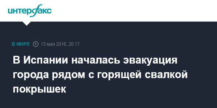 Москва. 13 мая. INTERFAX.RU - Не менее 8 тыс. жителей испанского городка Сесеньо в 30 км от Мадрида были вынуждены покинуть дома из-за сильного пожара на расположенной неподалеку свалке автопокрышек, на которой ранее разгорелся сильный пожар, сообщает агентство The Associated Press.