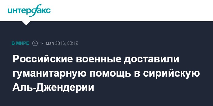 Москва. 14 мая. INTERFAX.RU - Более тонны гуманитарной помощи доставили российские военные в центр по приему беженцев в населенном пункте Аль-Джендерия сирийской провинции Латакия, сообщил представитель Центра по примирению враждующих сторон в Сирии полковник Павел Баринов.