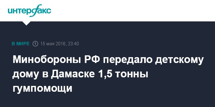 Москва. 15 мая. INTERFAX.RU - Российские военные передали детскому дому в Дамаске 1,5 тонны гумпомощи, сообщает Минобороны РФ.