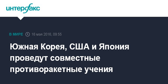 Москва. 16 мая. INTERFAX.RU - Южная Корея, США и Япония в июне впервые проведут совместные учения, направленные на отражение ракетной угрозы со стороны КНДР, сообщают в понедельник южнокорейские СМИ со ссылкой на неназванного представителя южнокорейского министерства обороны.