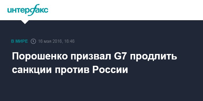 Москва. 16 мая. INTERFAX.RU - Президент Украины Петр Порошенко на встрече с аккредитованными в Киеве послами стран "большой семерки" (G7) заявил о необходимости продолжения действия санкций против России в связи с невыполнением Минских договоренностей.