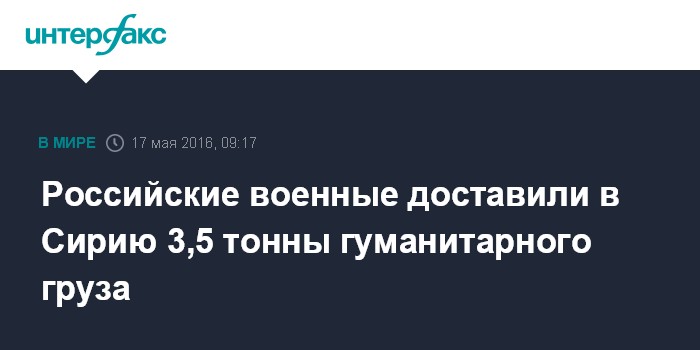Москва. 17 мая. INTERFAX.RU - Около 3,5 тонн гуманитарной помощи, в том числе хлеб, выпеченный в Сирии из российской муки, доставили в сирийскую провинцию Хомс для учеников и преподавателей школы в селе Аль-Канакия.