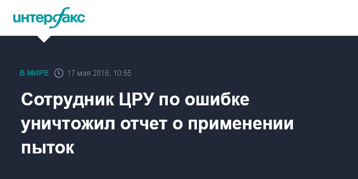 Москва. 17 мая. INTERFAX.RU - Один из сотрудников службы генерального инспектора в ЦРУ уничтожил свой единственный экземпляр скандального доклада, подготовленного комитетом Сената США по разведке и посвященного использованию ведомством пыток при допросах.