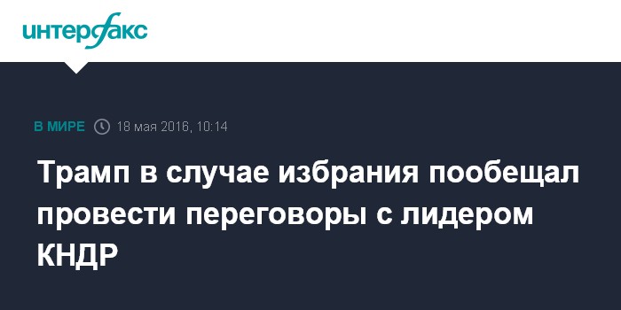 Москва. 18 мая. INTERFAX.RU - Претендент на пост президента США республиканец Дональд Трамп сообщил, что начнет переговоры с лидером КНДР Ким Чен Ыном, если его изберут президентом.