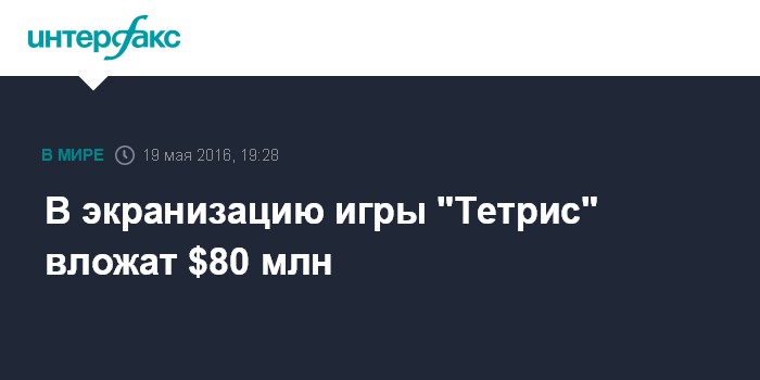 Москва. 19 мая. INTERFAX.RU - Американо-китайская Threshold Global Studios намерена потратить около $80 млн на экранизацию советской игры "Тетрис".