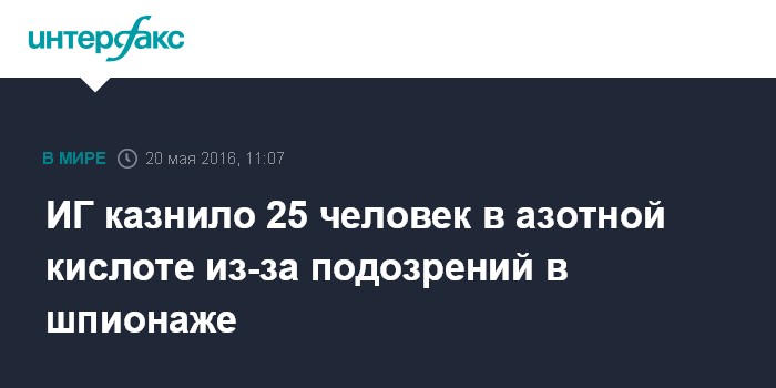 Москва. 20 мая. INTERFAX.RU - Экстремистская группировка "Исламское государство" (запрещенная в России) казнила 25 человек по обвинению в шпионаже, погрузив подозреваемых в большой резервуар с азотной кислотой, сообщает The International Business Times.
