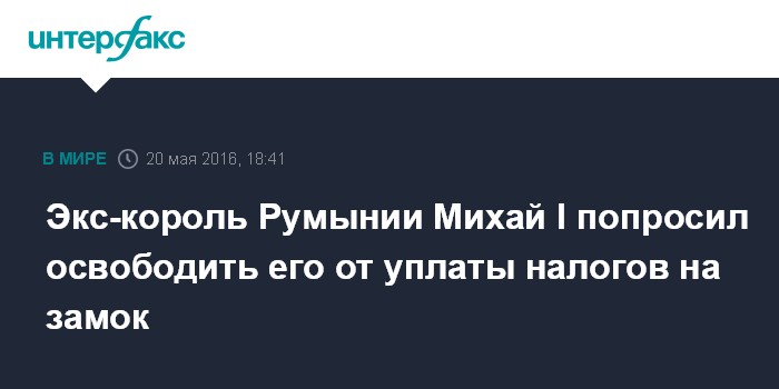 Москва. 20 мая. INTERFAX.RU - Бывший король Румынии Михай I попросил освободить его от уплаты налогов на замок в западной Румынии на том основании, что он является ветераном Второй мировой войны, сообщает Associated Press.