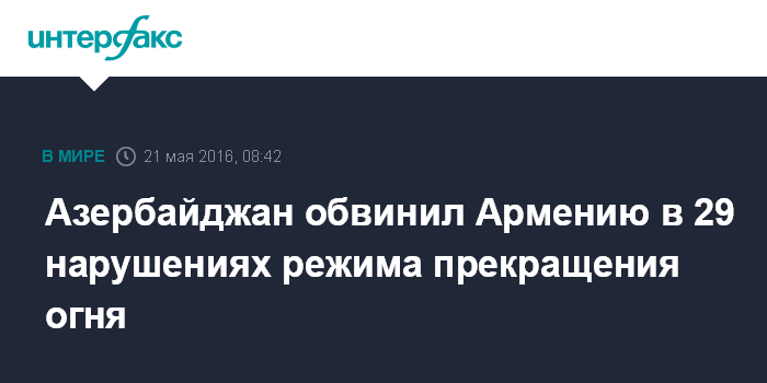 Москва. 21 мая. INTERFAX.RU - Вооруженные силы Армении нарушили за минувшие сутки режим прекращения огня на линии соприкосновения азербайджанских и армянских вооруженных сил 29 раз, сообщает в субботу пресс-служба министерства обороны Азербайджана.